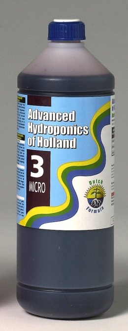 Základní hnojivo Dutch Formula Micro od společnosti Advanced Hydroponics of Holland. Biominerální výživa pro rostliny, která obsahuje základní živiny NPK (dusík, fosfor, draslík). Dutch Formula je třísložkové hnojivo (Grow, Bloom a Micro), které se používá vždy společně podle dávkovacího schématu Advanced Hydroponics. Hnojivo Dutch Formula Micro je vhodné pro všechna pěstební média. Pokud pěstujete v hlíně, dávkujte hnojivo poloviční dávkou oproti doporučené. Pro maximální výnos, příjemnou chuť a pevné palice používejte trojsložková hnojiva Dutch Formula společně s řadou doplňků Advanced Natural Power (Root Stimulator, Enzymes +, Growth/Bloom Excellerator a Final Solution).