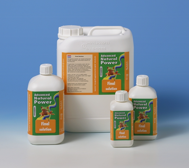 Advanced Natural Power Final Solution od společnosti Advanced Hydroponics of Hollands. Doplňkový přípravek pro vyčištění rostliny od hnojiv a látek ovlivňujících chuť. Advanced Natural Power Final Solution je průplachový přípravek, který se používá v posledních dvou týdnech před sklizní. Nekombinuje se se žádnými hnojivy ani doplňky a je vhodný pro všechny typy pěstebních médií. Obsahuje minimální množství živin. Používáním Advanced Natural Power Final Solution zlepšíte chuť rostliny a finálního produktu, propláchnete přebytečný rostlinný odpad a zbytky hnojiv a zároveň působí preventivně proti napadení plísní.