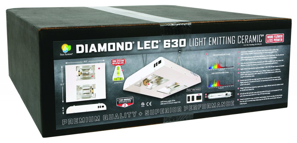 Sun System® Diamond® nízkoprofilová svítidla LEC® značky 630 watt využívají špičkovou technologii Light Emitting Ceramic®. Nejmodernější 95% reflexní německý hliníkový interiér nabízí jedinečný výstup, odrazivost a rozptyl světla. Diamant® LEC® Brand 630 Diamond® LEC® Brand 315 má vysokofrekvenční elektronický předřadník Philips s vysokou účinností a s nízkým kmitočtem 50/60 Hz na čtvercové vlně. Předřadník vykazuje vysokou životnost, díky které může být zatěžován nejméně 50 000 pracovních hodin.